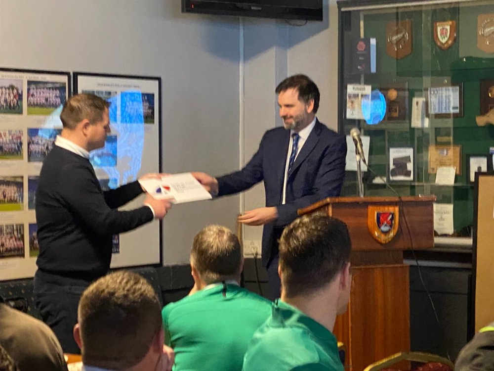 A l'issue du match, la réception organisée par nos amis irlandais fut l'occasion de présenter l'emblème officiel de la Coupe du monde des parlementaires 2023, créé par notre partenaire Inconito. C'est Laurent Saint-Martin, capitaine du match, qui le remit à son homologue Neil.